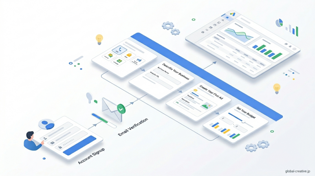 この記事では、アカウント作成から広告が表示されるまでの流れを、実際の操作に沿って丁寧に整理しています。どこで何を設定すればいいのかが一つずつ分かるように、順を追って説明していきますので、安心して読み進めてみてください。