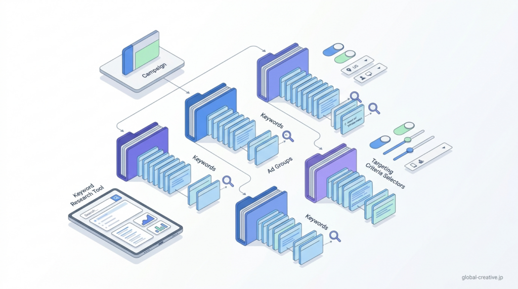 広告グループとキーワードは、まず1つのテーマに対して広告グループを1つ作成し、その中に関連するキーワードを5〜10個程度登録します。キーワードは、実際に検索される語句をそのまま入力し、「完全一致」「フレーズ一致」などのマッチタイプを選んで設定します。