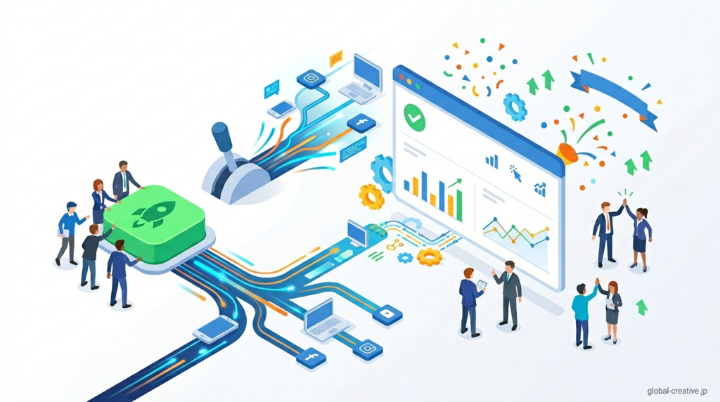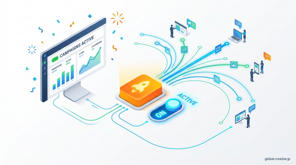 広告配信を開始するには、作成したキャンペーン・広告文・予算・入札設定・支払い情報をすべて確認し、管理画面の「公開」または「有効化」をクリックします。公開後はすぐに表示されるわけではなく、通常は数時間から最大1営業日ほどの審査が行われ、ポリシー違反がなければ配信が開始されます。