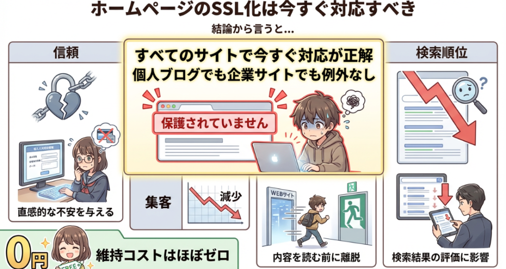 個人ブログでも企業サイトでも例外はなく、httpsにしていない状態は信頼・集客・SEOのすべてで不利になります。