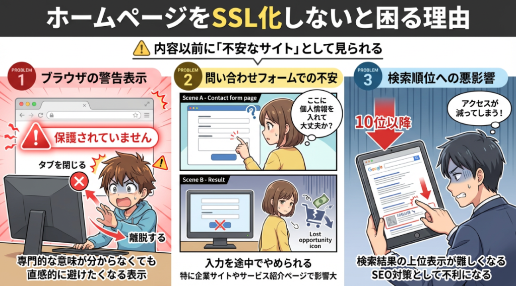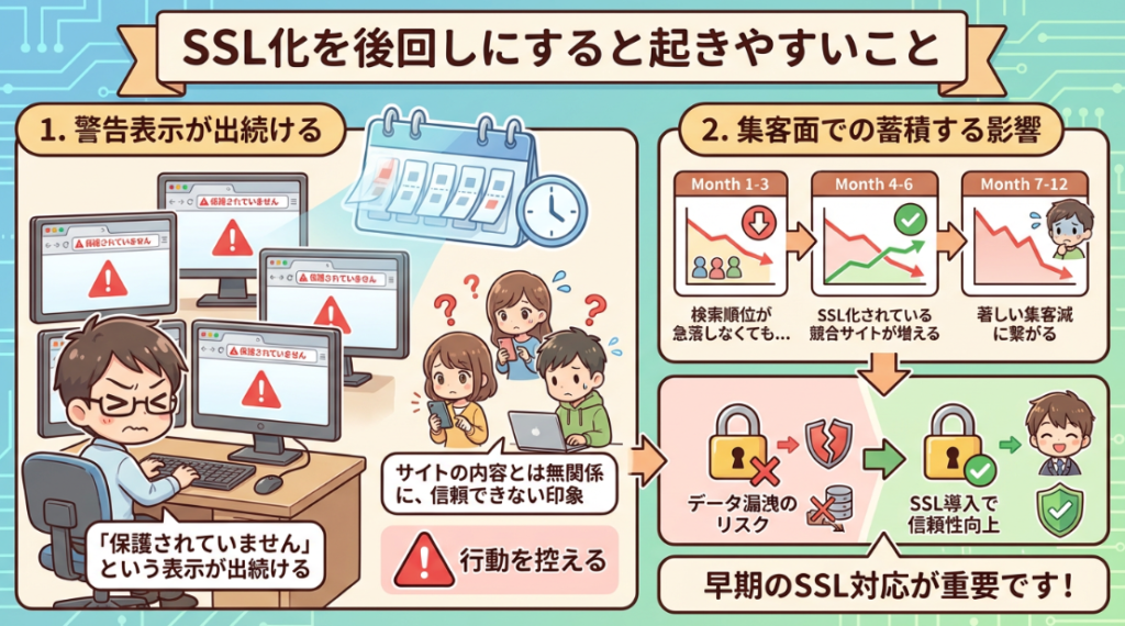 集客面でも影響は蓄積します。検索順位が急落しなくても、同じテーマでSSL化されている競合サイトが増えるほど、相対的に評価されにくくなります。結果として、アクセス数や問い合わせ数が伸びにくい状態が続きます。
