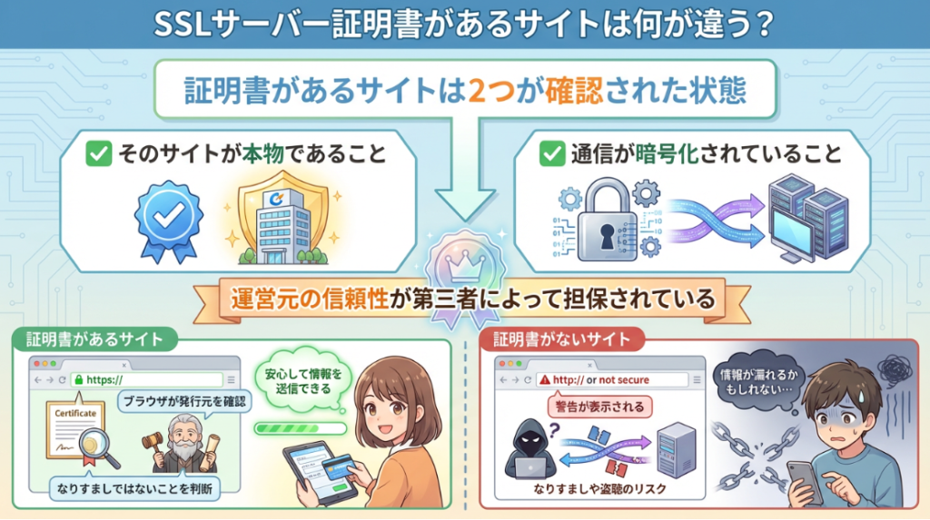 SSLサーバー証明書があるサイトは、「そのサイトが本物であること」と「通信が暗号化されていること」の両方が確認された状態になります。証明書がないサイトとの一番の違いは、運営元の信頼性が第三者によって担保されている点です。