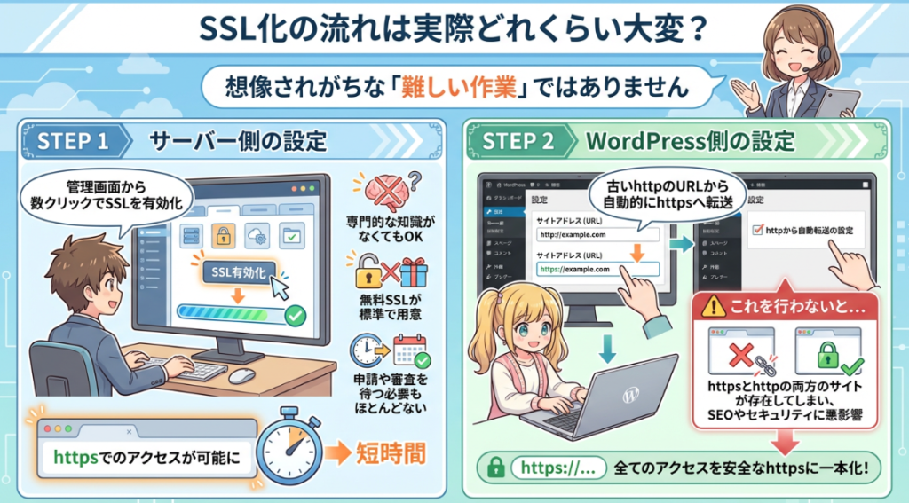 SSL化は、想像されがちな「難しい作業」ではありません。多くのレンタルサーバーでは、管理画面から数クリックでSSLを有効化でき、専門的な知識がなくても対応できます。