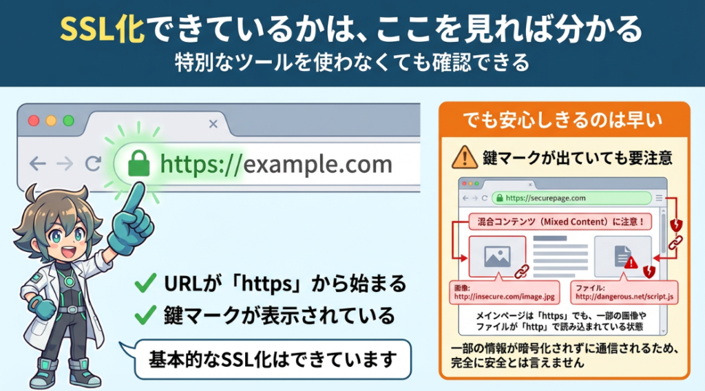 SSL化が正しくできているかどうかは、特別なツールを使わなくても確認できます。まず見るべきなのは、ブラウザのアドレスバーです。URLが「https」から始まり、鍵マークが表示されていれば、基本的なSSL化はできています。