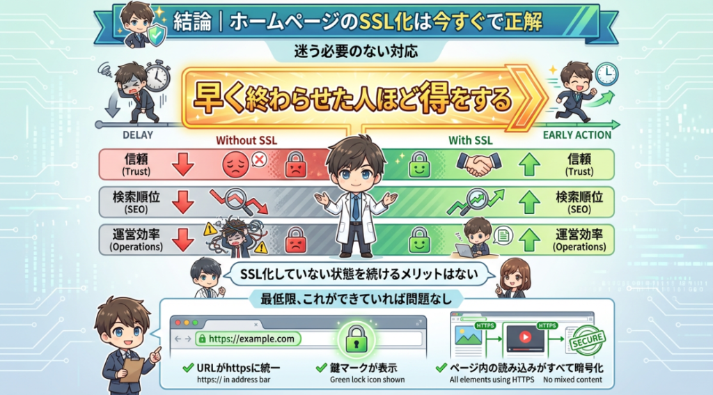 結論から言うと、ホームページのSSL化は迷う必要のない対応で、早く終わらせた人ほど得をします。信頼・SEO・運営効率のすべてにおいて、SSL化していない状態を続けるメリットはありません。