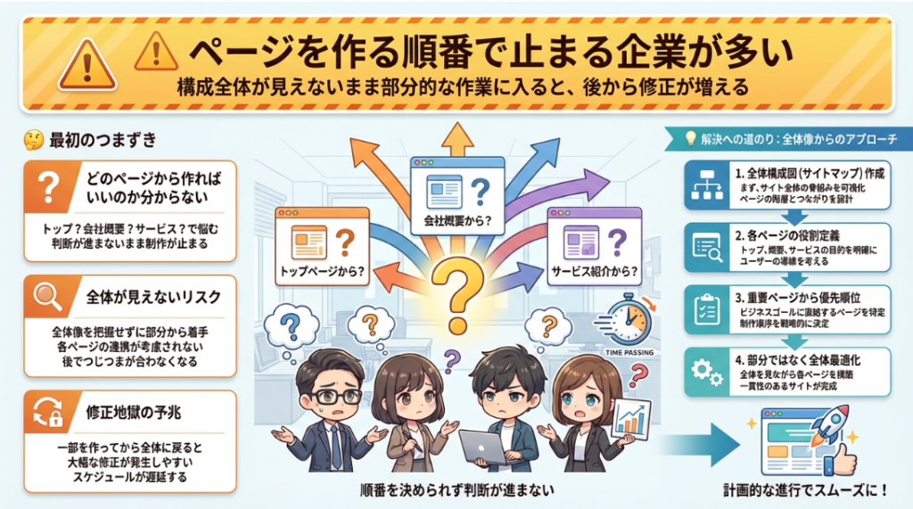 企業HPのサイト構成で最初につまずくのは、どのページから作ればいいのか分からなくなる点です。トップページ、会社概要、サービス紹介のどれを先に用意するかで悩み、判断が進まないまま制作が止まります。順番を先に決めようとすると、構成全体が見えないまま部分的な作業に入ってしまい、後から修正が増えやすくなります。