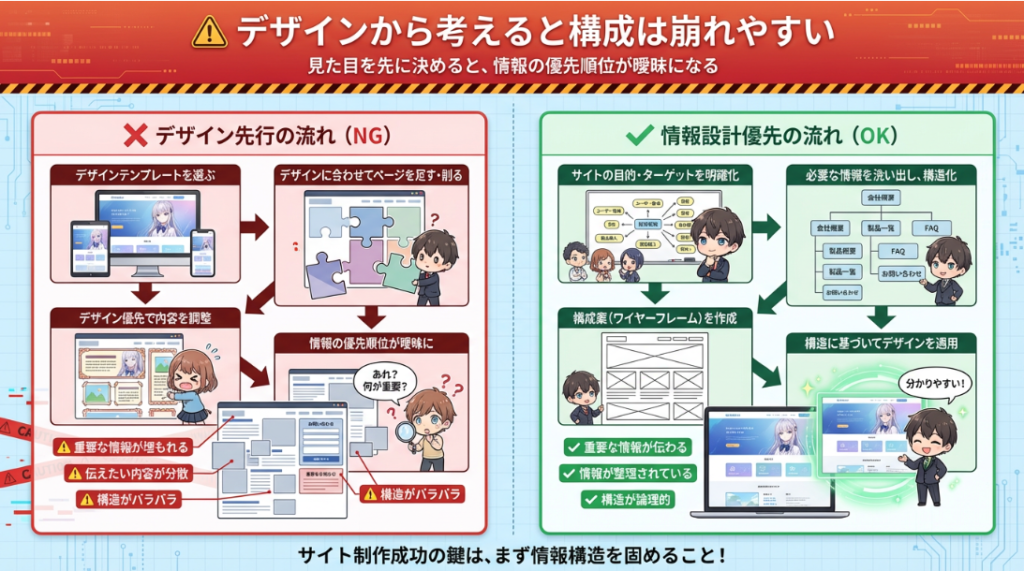 見た目を先に決める考え方は、企業HPのサイト構成では不利に働きます。デザインに合わせてページを足したり削ったりする流れになるため、情報の優先順位が曖昧になります。結果として、重要な情報が埋もれたり、伝えたい内容が分散した構成になりがちです。