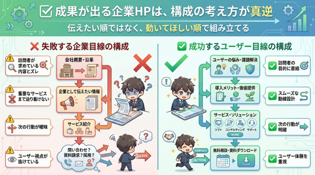 企業HPのサイト構成は、伝えたい順ではなく、動いてほしい順で組み立てたほうが成果につながります。考え方を切り替えるだけで、構成の迷いは大きく減ります。