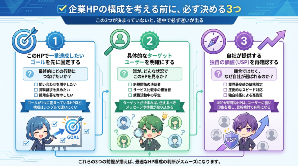 結論から言うと、企業HPのサイト構成は「ページを作り始める前に、ゴールと導線を先に固定する」考え方で決めるのが最もおすすめです。見た目や掲載内容から考える構成は失敗しやすく、成果を出したいなら最初に判断基準を揃えるべきです。