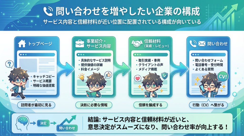 問い合わせを重視する企業HPは、サービス内容と信頼材料が近い位置に配置されている構成が向いています。