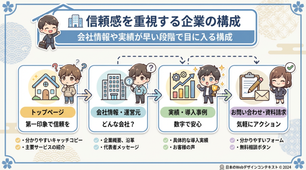 信頼を重視する場合は、会社情報や実績、第三者評価が早い段階で目に入る構成が効果的です。