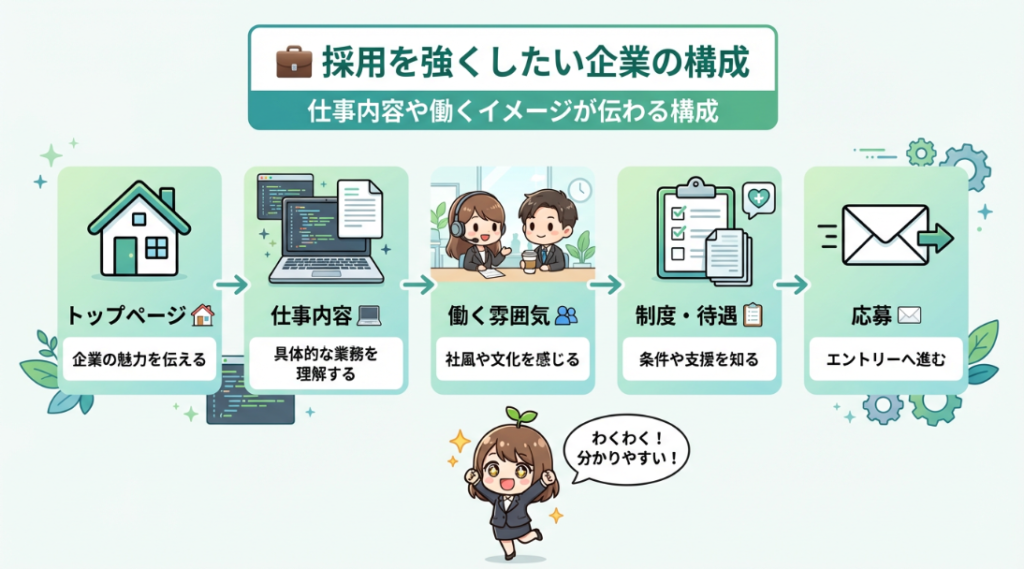 採用を目的とする企業HPは、仕事内容や働くイメージが伝わるページを中心に構成したほうが反応が出やすくなります。