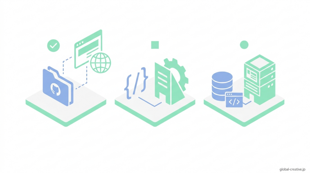 特に「フロントエンドだけで完結するのか」「バックエンドも含めて動かしたいのか」で選ぶべき選択肢は明確です。