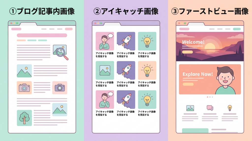 用途ごとに画像の役割が違うなら、適切なサイズも変わります。ブログ本文に挿入する画像、記事一覧やSNSで表示されるアイキャッチ・OGP画像、画面いっぱいに表示する全幅のメインビジュアルでは、横幅・縦横比・解像度の基準がそれぞれ異なります。ここでは、用途別に具体的な目安サイズを整理します。
