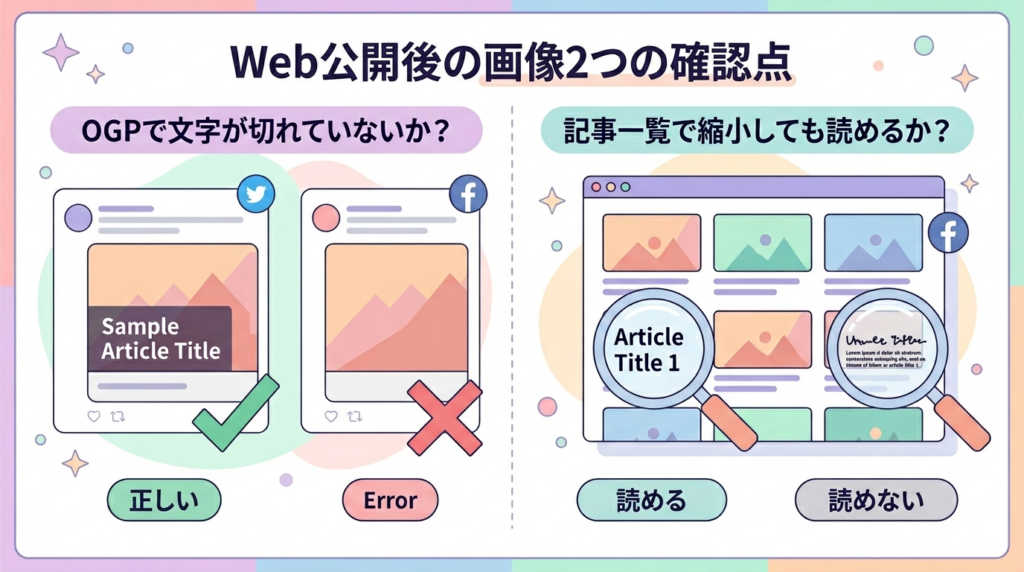 画像は作ってアップロードした時点で終わりではありません。公開後に実際の表示画面で確認しないと、OGPで文字が切れていたり、記事一覧で縮小されたときに読めなくなっていたりすることがあります。ここでは、公開後に必ずチェックしておくべき表示ポイントを整理します。