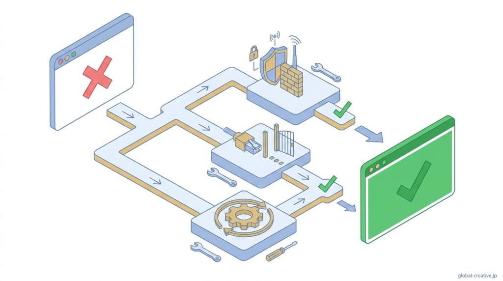 特に確認すべきポイントは、Webサーバーが使用するポート(80番)が外部からアクセス可能かどうかと、サーバー側のファイアウォールで通信が遮断されていないかの2点です。