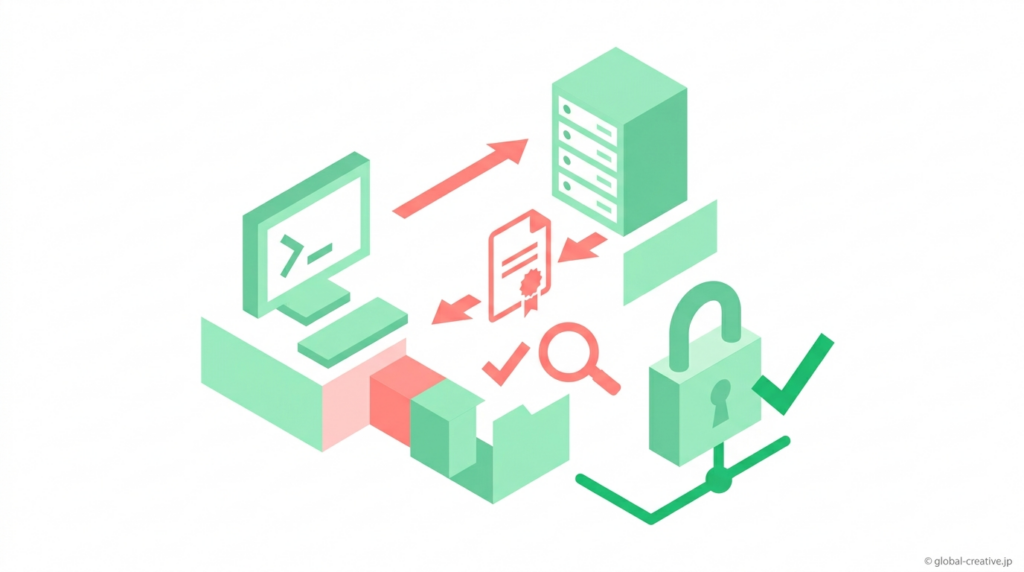 SSL検証とは、ブラウザがアクセスしたサイトのSSL証明書について、「その証明書が本当に正しいものか」を接続のたびに確認する処理です。