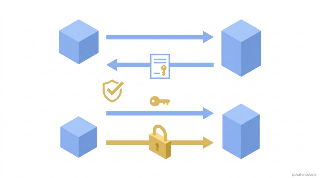 ブラウザは、ドメイン名が一致しているか、証明書の有効期限が切れていないか、発行元が信頼できる認証局かの3つを順番に確認しています。すべて問題なければ、httpsや鍵マークが表示され、安全にページを開けます。